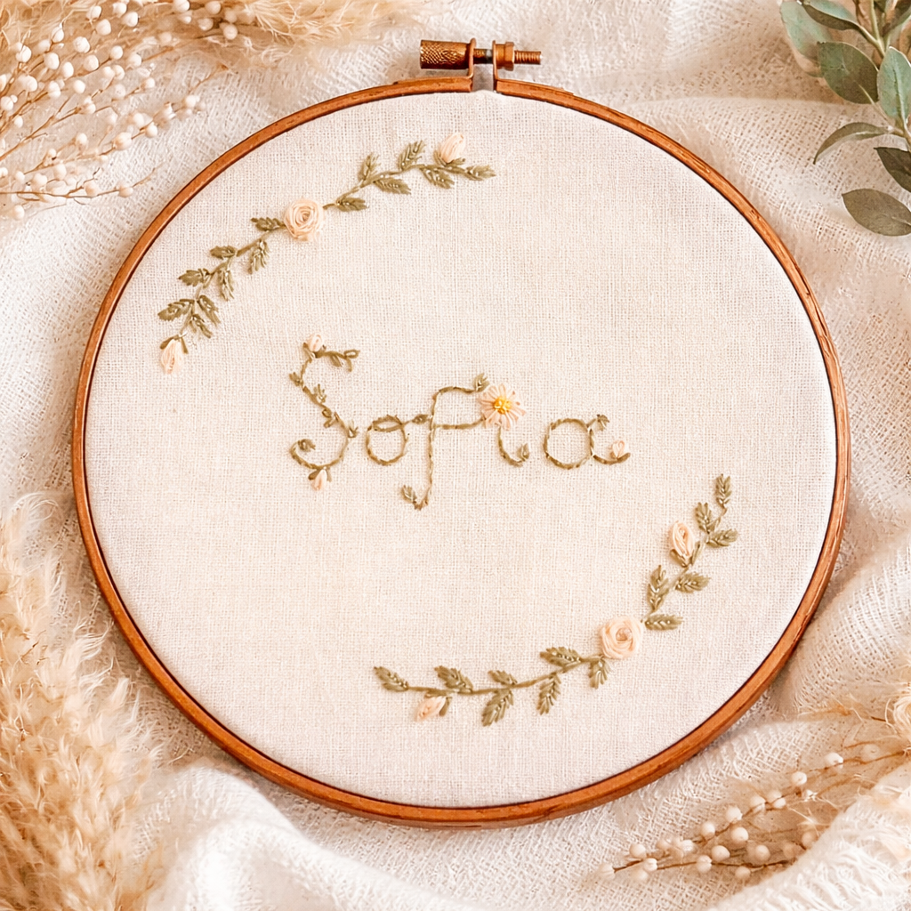 Delicado cuadro bordado a mano sobre tela de algodón natural, con diseño floral en tonos suaves y estilo cottagecore vintage.