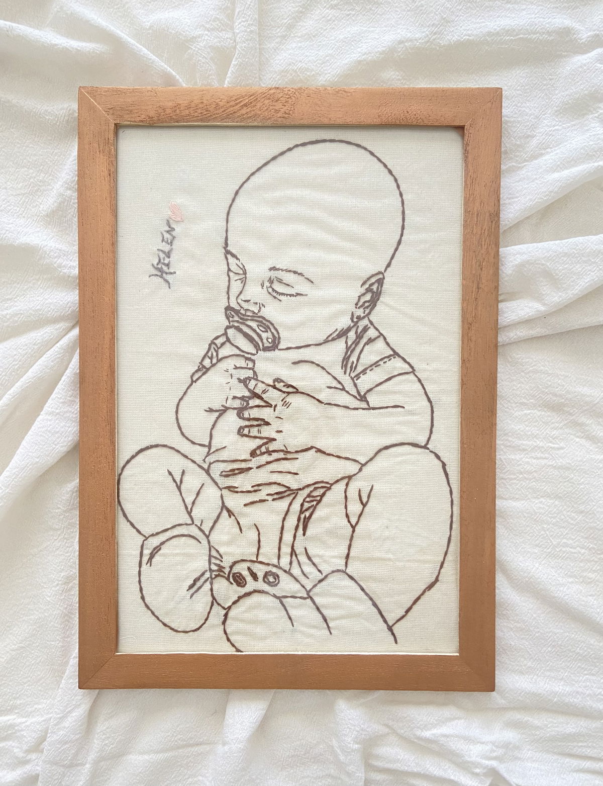 Una pieza delicada y atemporal, bordada completamente a mano con dedicación y paciencia en cada puntada. Este retrato captura la ternura y la calma en un diseño minimalista, ideal para decorar espacios con sensibilidad y calidez.